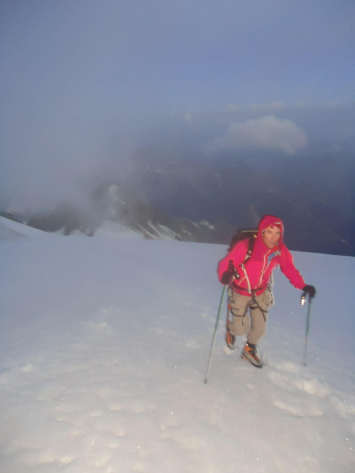 L'idée stupide d'un pote me fait me retrouver un soir à 22h sur le parking des Contamines pour rejoindre le Mt-Blanc via Bérangère/Dômes de Miage/Bionnassay. Grand fan des idées débiles, je ne peux que me joindre à ce truc à la con. Malheureusement, un imprévu humide dans le modèle météo nous stoppe au pied de l'aiguille de Bionnassay à 9h le lendemain.