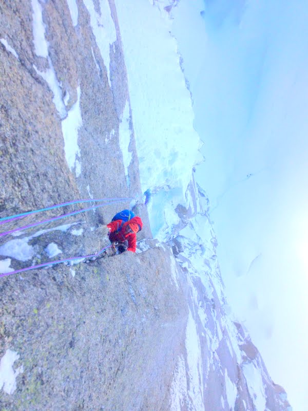 Arriver au pied, la fissure-dièdre de 55 mètres est tentante. Ce sacré topo est hallucinant de précision, il parle exactement d'un "dièdre pitonné à laisser" pour traverser à droite. Les 5/6 pitons estampillés EHM, ancêtre de l'EMHM depuis 1966, qui sont solidement planté dans la fissure nous convainc de nous y lancer. Le ceinture noir Kevin Gourde lance une belle attaque mais une tentative pour rejoindre une partie moins raide, l'oblige à un retours rapide à la fissure directe. L'escalade est super athlétique car les coincement nécessite de faire travailler les lames en bras de levier pour être efficaces. Avec les pieds sur des micro-grattons, ça devient laborieux et chaque mètre se mérite. 1cm de lame en moins plus tard, je parviens à une petite vire permettant un léger repos.